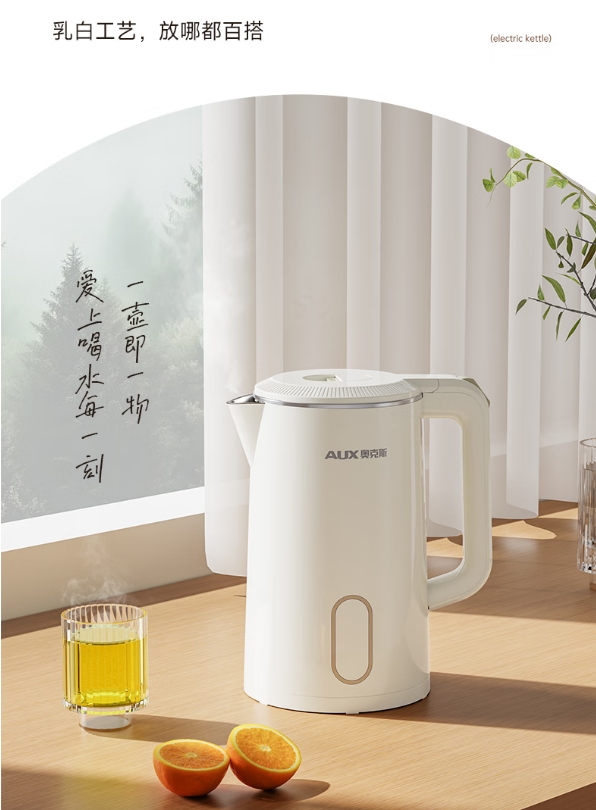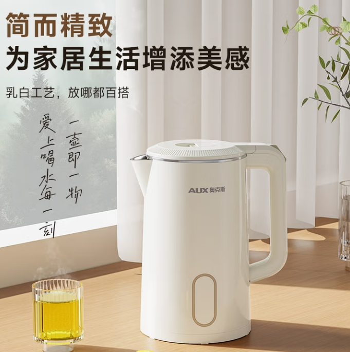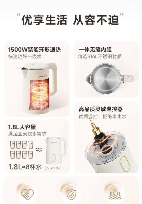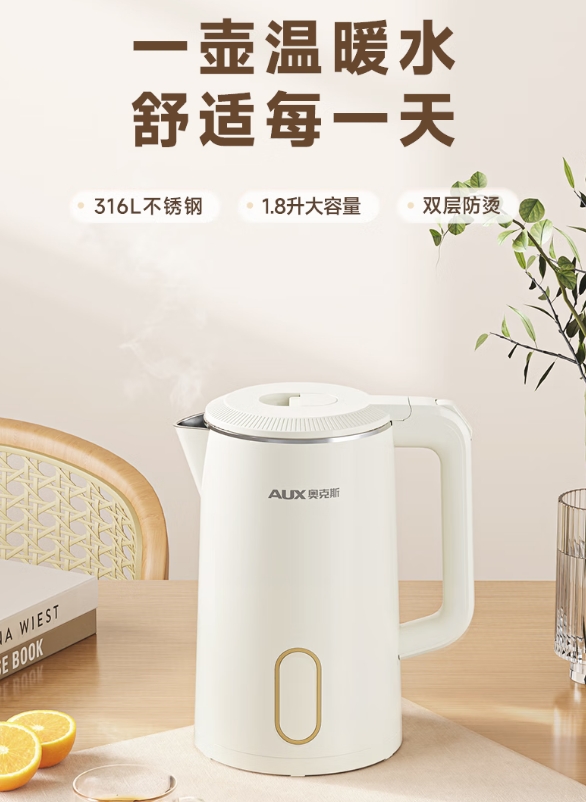 奥克斯(AUX)烧水壶电热水壶316L不锈钢 1.8L大容量无缝一体内胆电水壶 家用自动断电保温一体恒温开水壶 0涂层 1.8L 【316L不锈钢&无缝内胆】